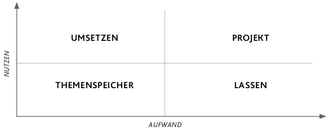 Ein bewährtes Modell im Zeitmanagement ist die Eisenhower-Matrix. Hier werden insgesamt vier Felder und zwei Achsen unterschieden. Die x-Achse ist der Verlauf mit dem Start 0 vom Aufwand. Bei der y-Achse wird die Priorität gesetzt.