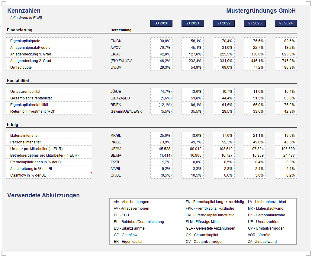 Zahlreiche Kennzahlen aus den Bereichen Finanzierung, Rentabilität, Erfolg u. Liquidität