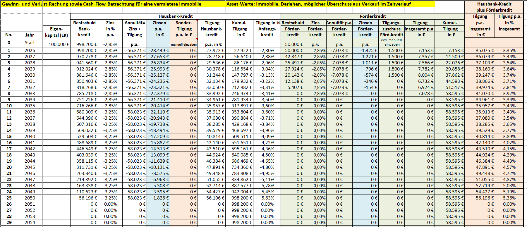 An Stelle eines Förderkredits kann dieser Eingabe-Bereich für einen 2. Anfangskredit mit unterschiedlichen Konditionen und unterschiedlicher Laufzeit genutzt werden.
