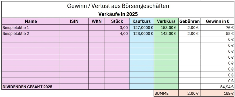 Diese Excel-Datei dient dazu, eine Übersicht über alle realisierten Gewinne und Verluste aus Aktienverkäufen des laufenden Jahres zu erhalten.