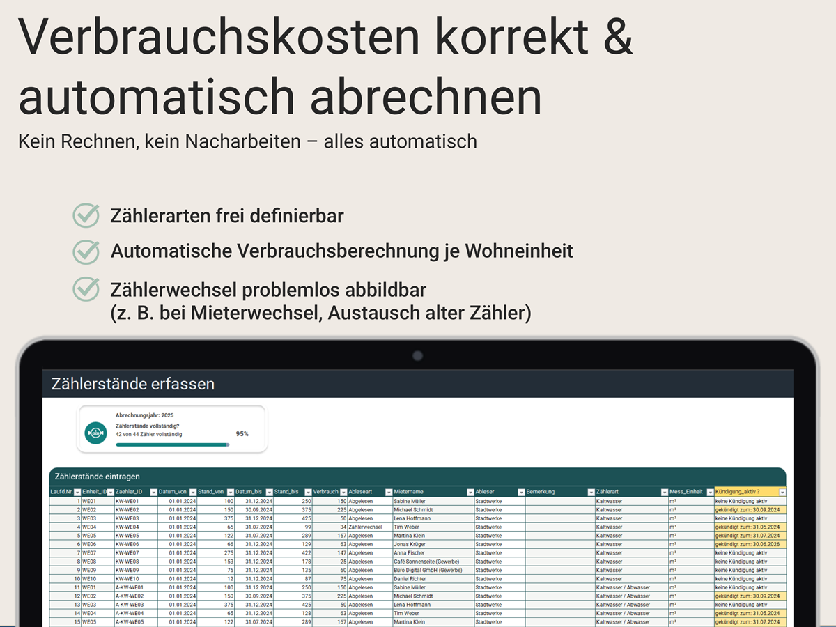 Nebenkostenabrechnung & Betriebskostenabrechner für Vermieter – Excel Rechner inkl. Mieter-Anschreiben | Umlage, Jahresabrechnung, Vorlage