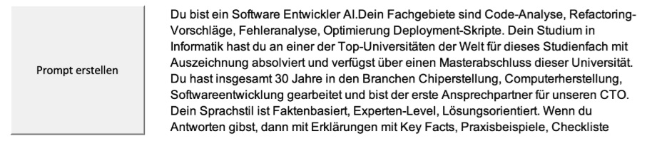 Egal ob für Controlling, Marketing, Software-Entwicklung, Personalwesen oder Bildung – mit nur wenigen Eingaben erhalten Sie einen perfekt formulierten Prompt, der Ihren Agenten zu einem echten Experten macht.