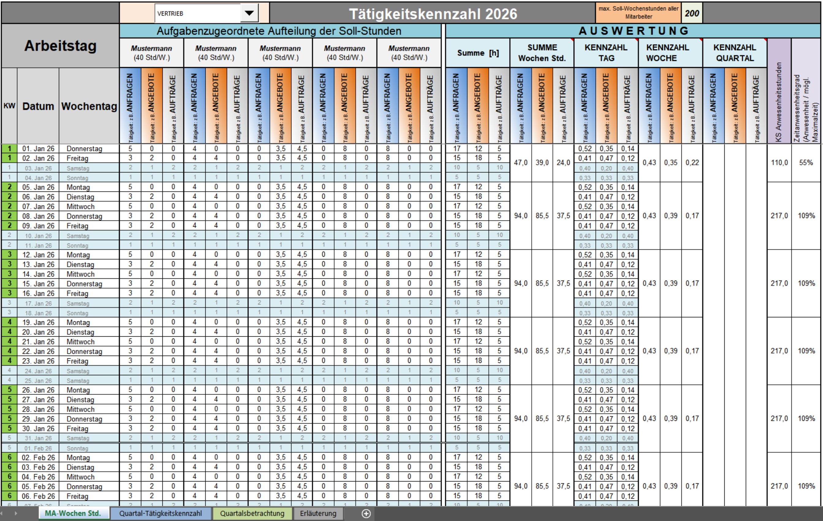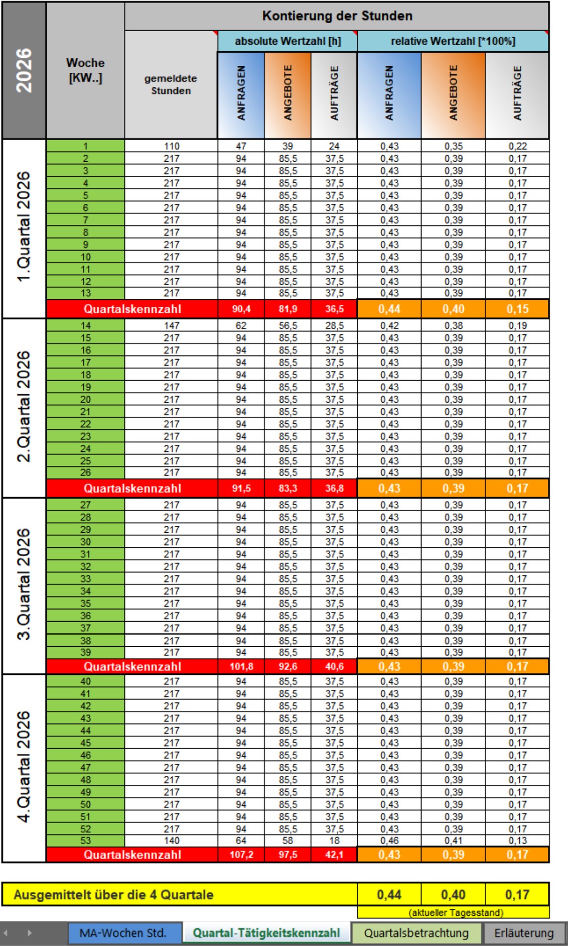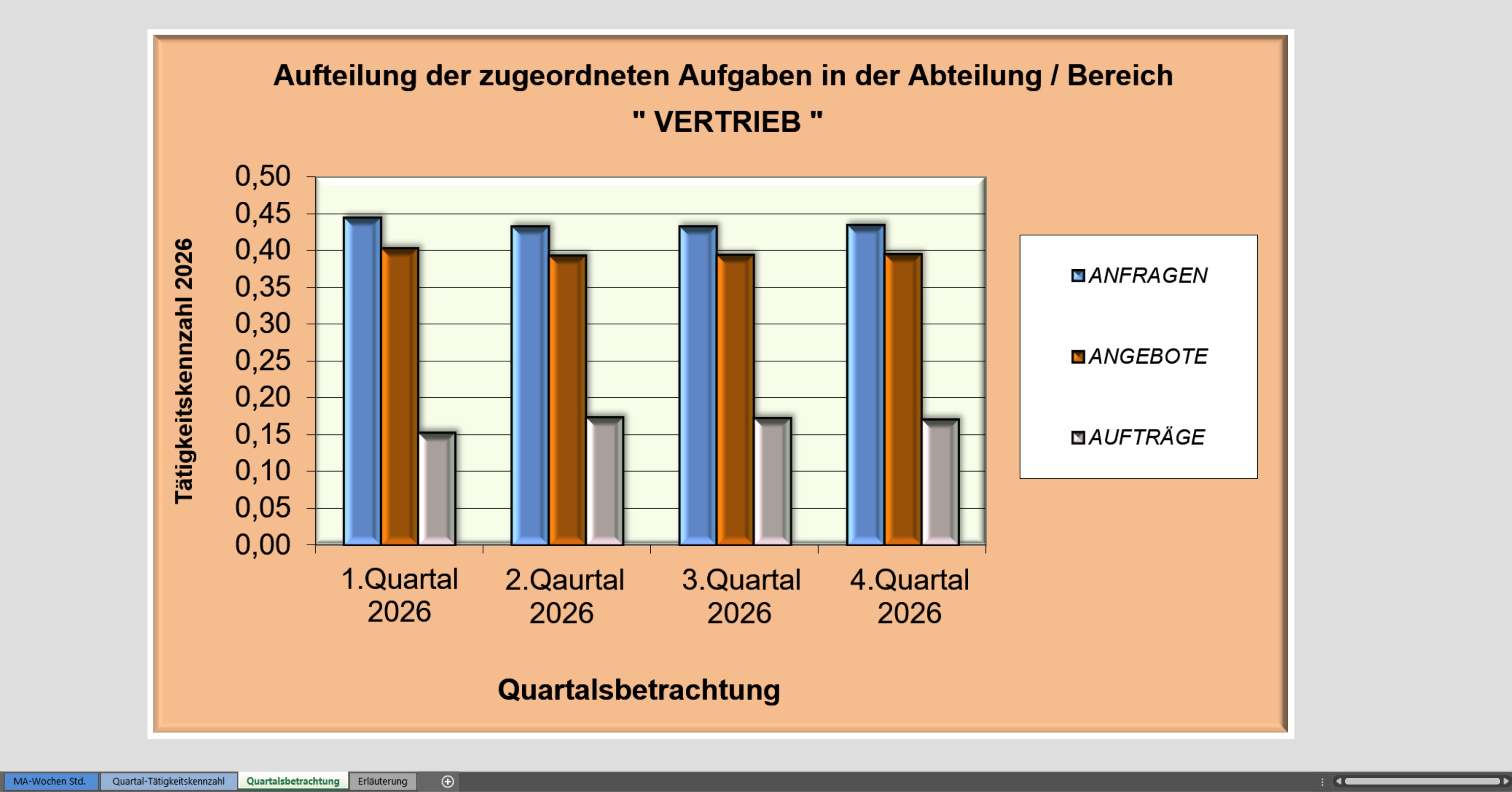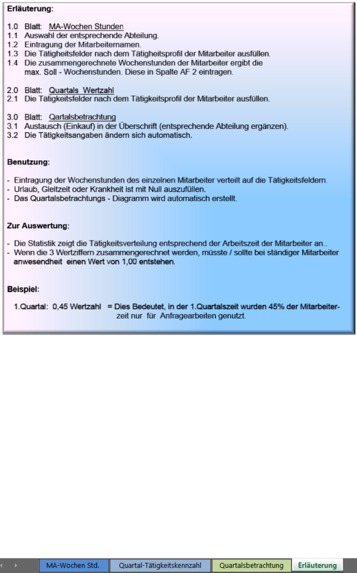 Hierbei handelt es sich um ein Statistikprogramm, dass die Tätigkeitsverteilung der Mitarbeiter in den verschiedenen Abteilungen anhand von eingetragenen Arbeitsstunden automatisch in einem Diagramm darstellt. Ideal für Projekte um zu analysieren, welche Bereiche, Aufgaben am meisten bearbeitet bzw. beansprucht wurde. Diese Bereiche sind auf 4 Quartale im Jahr aufgebaut.